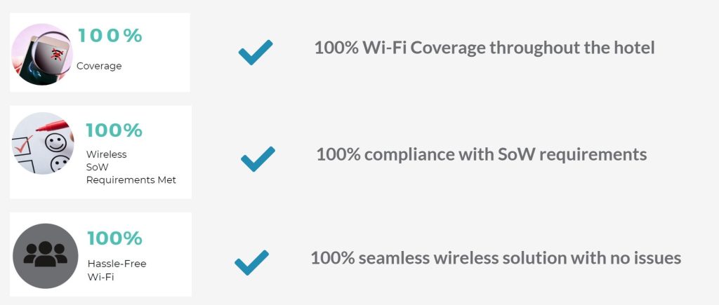 The off-plan design provided the hotel with an outstanding wireless solution, meeting or exceeding the SoW requirements.