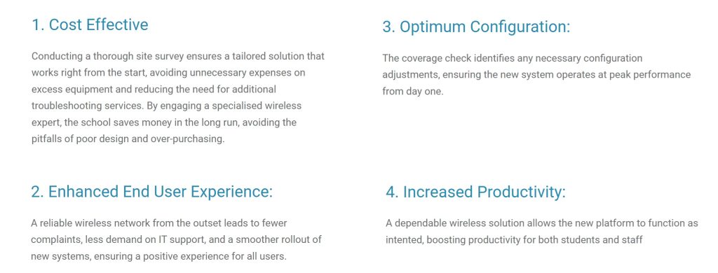 Cost effective: Conducting a thorough site survey ensures a tailored solution that works right from the start, avoiding unnecessary expenses on excess equipment and reducing the need for additional troubleshooting services. By engaging a specialised wireless expert, the school saves money in the long run, avoiding the pitfalls of poor design and over-purchasing.